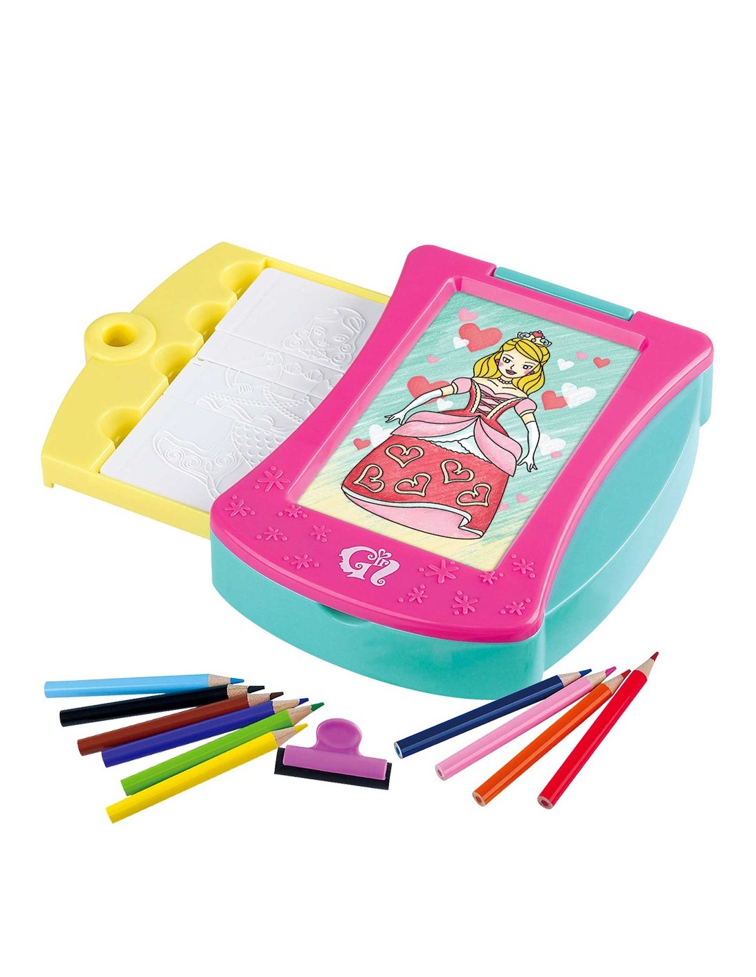 La cajita incluye todo lo necesario para empezar a diseñar: 10 lápices de colores, hojas para colorear los dibujos, plantillas intercambiables y combinables y 1 rodillo para marcar las plantillas en el papel.